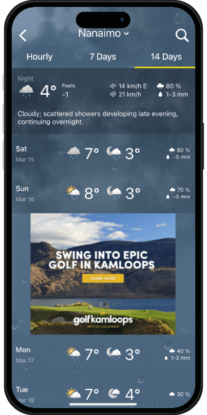 Les golfeurs ne jurent que par The Weather Network, qu’ils consultent avant chaque partie. Donc, lorsque nous avons lancé une campagne numérique pour promouvoir Golf Kamloops, un partenariat avec The Weather Network était tout naturel. Sa compréhension de notre public cible et ses capacités de ciblage nous ont permis de rejoindre les bonnes personnes au bon moment. En six semaines, la campagne a généré plus de 240 000 impressions et un impressionnant taux de clic de 1,55 % avec les vidéos interstitielles. Nous sommes ravis des résultats et de la valeur que ce partenariat a apportés à nos efforts de marketing de destination.