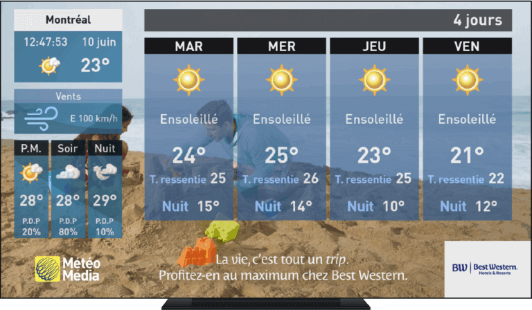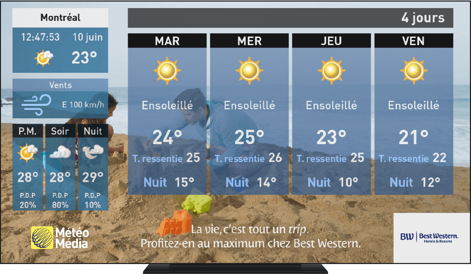 Produit à l’interne par The Weather Network et MétéoMédia. Doit être vendu dans le cadre de la commandite des prévisions locales. Pour la bannière animée : le code QR doit être affiché pendant une durée minimum suggérée de 5 secondes pour s’assurer que nos téléspectateurs ont suffisamment de temps pour le scanner.