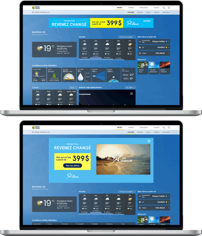 Idéal pour les marques qui cherchent à révéler des offres et des produits dans un format interactif, le Pushdown offre un espace publicitaire additionnel via un panneau d’extension initié par l’utilisateur pouvant même inclure un lecteur vidéo. Option de l’associer à un double big box pour renforcer la présence de votre marque sur la page, ou de l’exécuter dans le cadre d’une domination ou d’un IBR pour une présence maximale de votre marque.