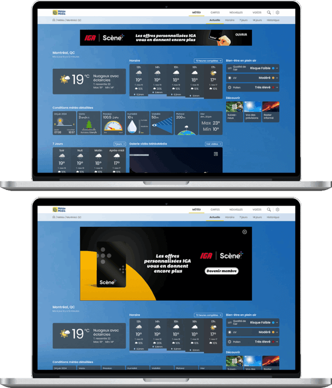Idéal pour les marques cherchant à révéler des offres et des produits dans un format interactif, le Pushdown offre un espace publicitaire supplémentaire via un panneau d’expansion initié par l’utilisateur. Option de le combiner avec un Big Box pour renforcer la présence de votre marque sur la page, ou de l’exécuter dans le cadre d’une domination d’une journée ou par impression pour un impact maximal de la marque.